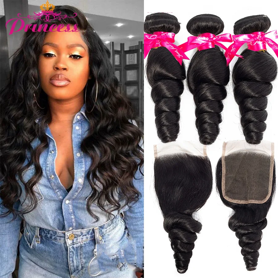 Name: Mechones de ondas sueltas de princesa con cierre, mechones brasileños con cierre, cabello humano Remy, 3 mechones