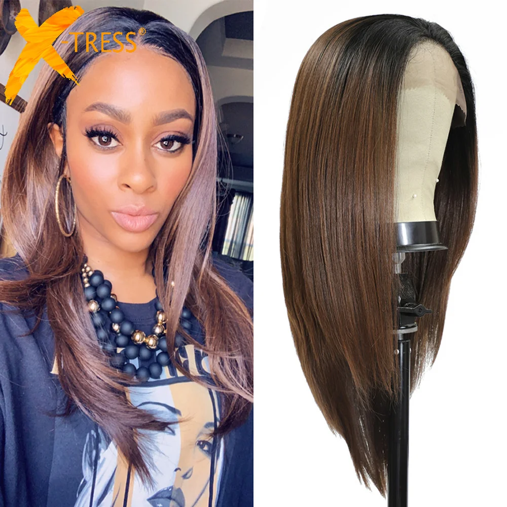 Name: Peluca con malla frontal sintética para mujer, Marrón degradado recto cabello largo, malla con división pelucas con minimechones X-TRESS, peluca de moda diaria