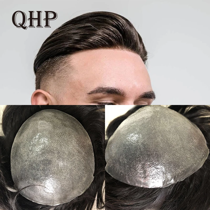 Name: Peluca de cabello humano para hombre, tupé de piel sintética con sistema de cabello fino suave de 0,06mm de grosor, hecha a mano, con prótesis capilar Natural