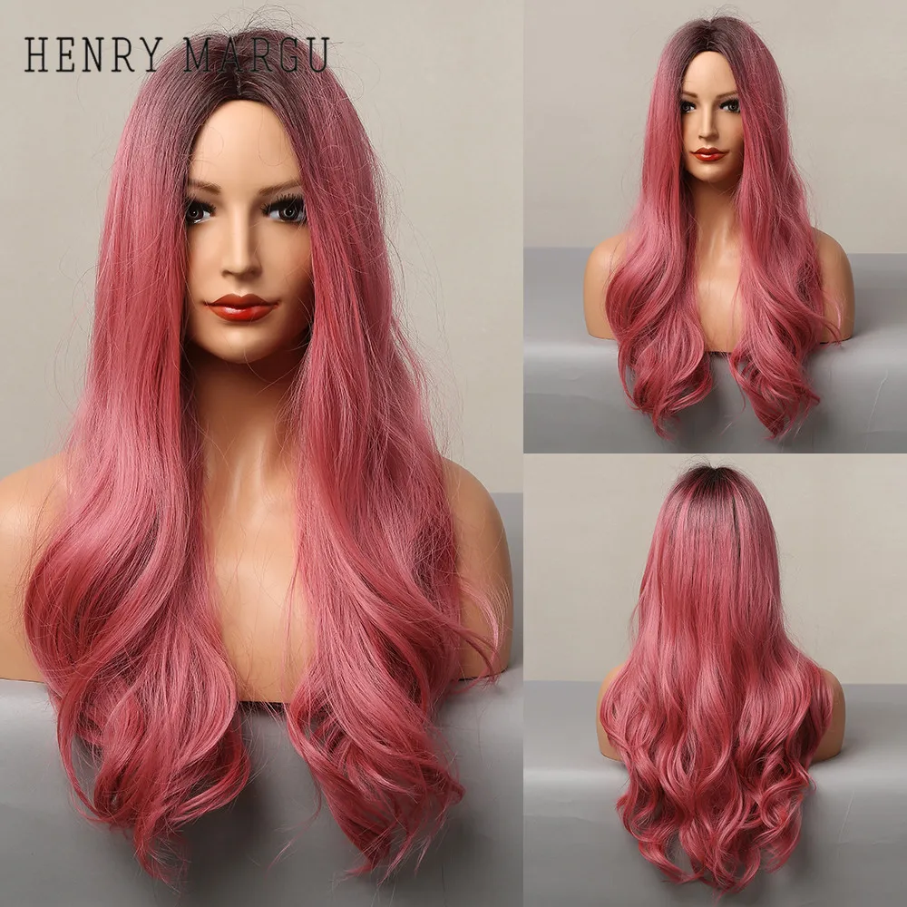 Name: HENRY MARGU-Peluca de cabello sintético para mujer, largo ondulado, ombré, negro, rojo rosado, fiesta de Cosplay, a diario, de alta temperatura